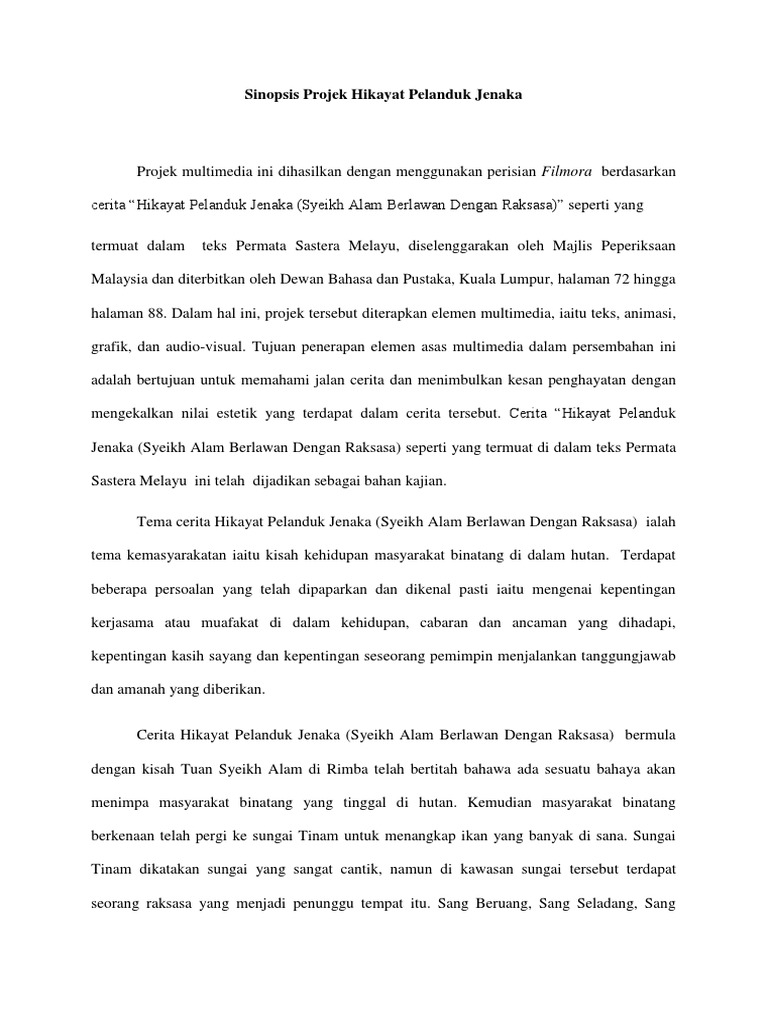 Sinopsis Hikayat Pelanduk Jenaka / Alam Dan Budaya Masyarakat Melayu Dalam Hikayat Pelanduk Jenaka Universiti Putra Malaysia Institutional Repository - Hikayat pelanduk jenaka hikayat pelanduk jenaka (syeikh alam berlawan dengan raksasa) sinopsis tuan syeikh alam di rimba telah bertitah bahawa ada suatu bahaya akan menimpa masyarakat. Cerita ini mengisahkan tentang seekor pelanduk yan g menggunakan kepandaiannya untuk melawan seor ang gergasi yang menggangu ketenteraman dan me mbunuh penduduk rimba. Para menteri, pengawal kerajaan, dan rakyatpun ikut berlutut serta menyembah, dan meminta maaf. Hikayat pelanduk jenaka hikayat pelanduk jenaka (syeikh alam berlawan dengan raksasa) sinopsis tuan syeikh alam di rimba telah bertitah bahawa ada suatu bahaya akan menimpa masyarakat Para menteri dan pengawal kerajaan menceritakan bahwa kerajaan patik ini sudah tidak ada rajanya, karena telah kembali ke rahmatullah. Berlawan dengan raksasa) inilah hikayat peri menyatakan nabi wafat.